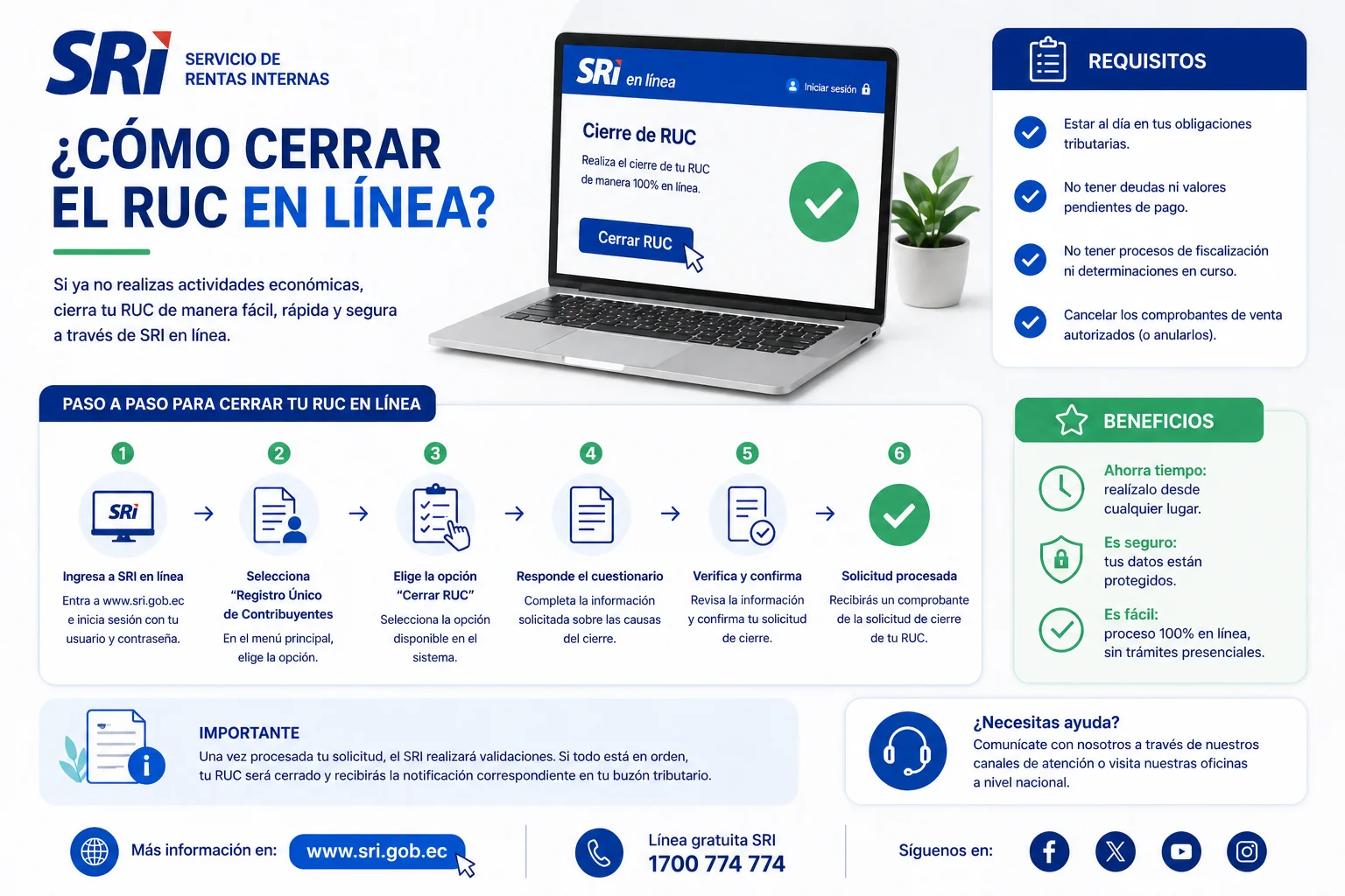 En personas naturales, el SRI permite suspender o cancelar el RUC accediendo con clave al portal transaccional SRI en Línea. En sociedades, la cancelación puede requerir procesos adicionales, documentación legal y validación del estado de la entidad.